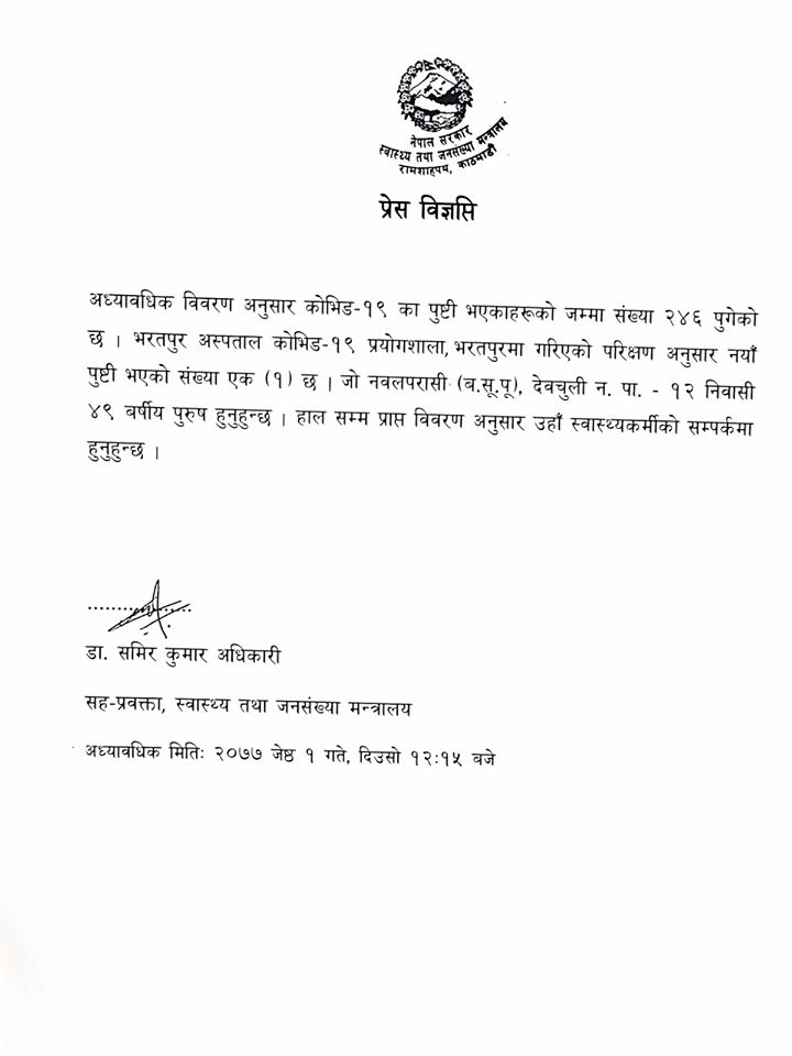 भरतपुर कोभिड–१९ प्रयोगशालामा बिहीबार गरिएको स्वाब परीक्षणमा कोरोना संक्रमण पुष्टी भएको हो । योसँगै नेपालमा कोरोना भाइरसबाट सक्रमित हुनेको संख्या २४६ पुगेको छ ।