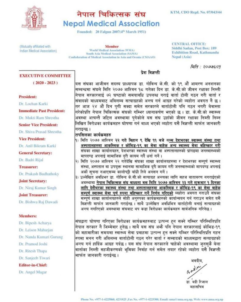 त्यसैगरी शुक्रबार देशभर आकस्मिक र कोरोना उपचारबाहेक अन्य स्वास्थ्य सेवा बहिष्कार गर्ने घोषणा संघले गरेको छ । अर्को निर्णय नहुँदासम्म सबै चिकित्सकले कालोपट्टी बाँधेर काम गर्ने भएका छ ।