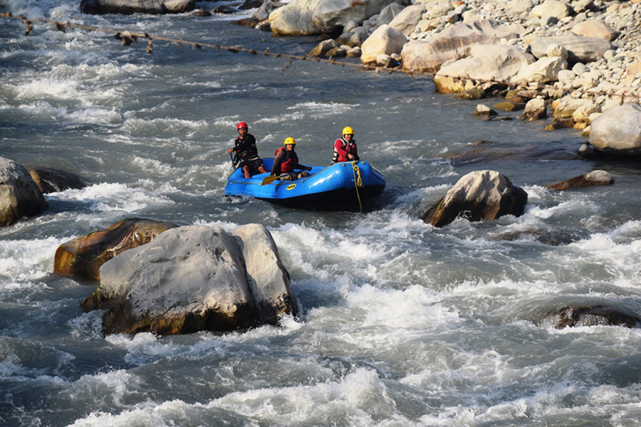 म्याग्दीको सदरमुकाम बेनी हुँदै बग्ने कालीगण्डकी नदीमा -याफ्टिङ गर्दै पर्यटक । कालीपुलमा हालै सञ्चालनमा आएको गण्डकी होटल र स्प्लास नेपाल एडभेन्चरले मङ्गलबारदेखि कालीगण्डकी नदीमा नियमित -याफ्टिङ सञ्चालनमा ल्याएका छन्। तस्बिरः कमल खत्री÷रासस