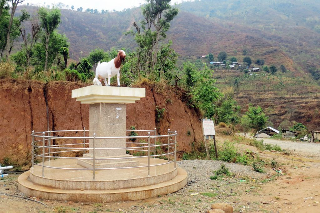 धनकुटा । धनकुटाको साँगुरीगढी गाउँपालिका–३ स्थित तमोरकरिडोरसँगै रहेको पालिकाको बाख्रा पकेट क्षेत्र कुशेटारमा किसानले निर्माण गरेको उन्नत जातको बोयर बाख्राको प्रतिमा । जिल्लामा ५० वटा बाख्रा फार्म सञ्चालनमा रहेको पशुसेवा कार्यालय धनकुटाले जनाएको छ । तस्बिरः नारायणकुमार राई/रासस