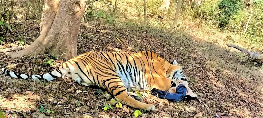 बाँकेको राप्ती सोनारी गाउँपालिका–६ स्थित राप्ती पीडित तथा गुलरी सामुदायिक वन उपभोक्ता समूहबाट गत आर्थिक वर्ष ०७९/०८० मा मान्छे मार्ने बाघलाई चितवन कसरामा लैजानका लागि नियन्त्रणमा लिन डार्ट गरिएको वयस्क पाटेबाघ । तस्बिर: रुपनी जिएम/रासस