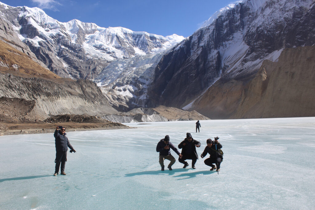 म्याग्दीको अन्नपूर्ण गाउँपालिका–४ मा रहेको नारच्याङ पञ्चकुण्ड तालमा चिसोले हिउँ जमेपछि त्यसमाथि रमाउदै पर्यटक । अन्नपूर्ण हिमालको फेदीमा रहेको पञ्चकुण्ड ताल चिसोका कारण पानी जमेको छ । तस्बिर ः सन्तोष गौतम÷रासस