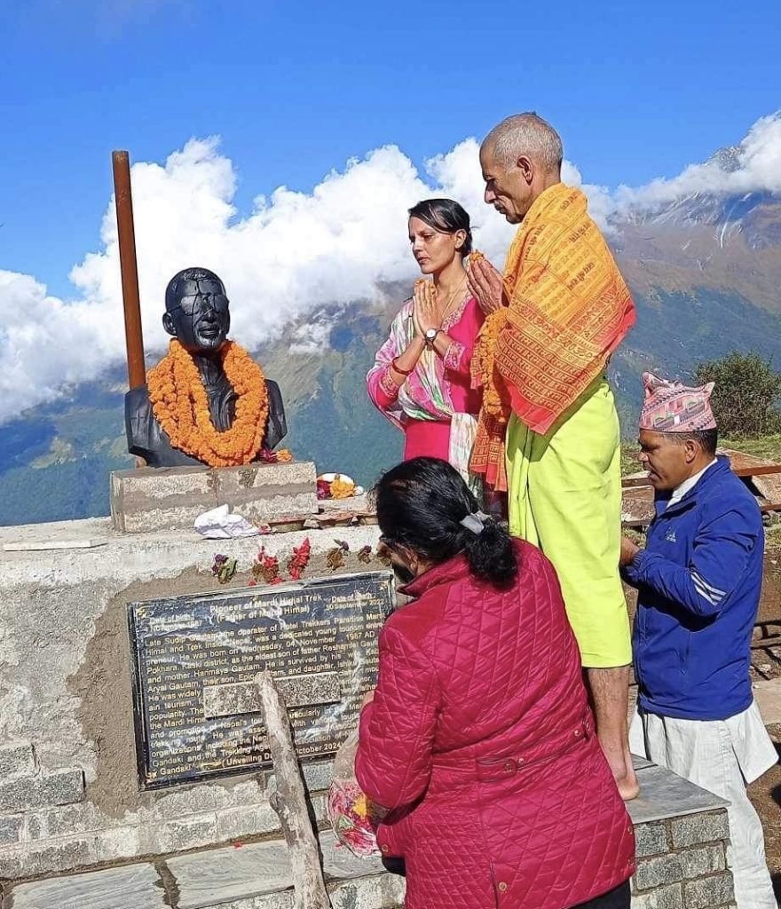 मर्दी हिमाल पर्यटन पदमार्गका पायनियर तथा अवधारणाकार साथै होटल ट्रेकर्स प्याराडाइज मर्दी हाइक्याम्प र ट्रेक इन्साइड नेपालका संचालक अग्रज पर्यटन ब्यबसायी स्व. सुदिप गौतमको अर्धकदको शालिक एक कार्यक्रमका बिच मर्दी पदमार्गको खुदारसिंग भन्ने स्थानमा हिजो २०८१ असोज २३ गते अनावरण गरिएको छ।