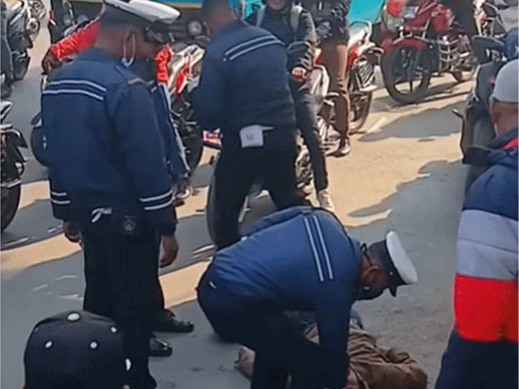 एक ट्राफिक प्रहरीले ती पुरूषलाई खुट्टाले हान्दै, उचाल्दै पछारेका छन् भने ती पुरूष अचेत भएको देखिन्छ।