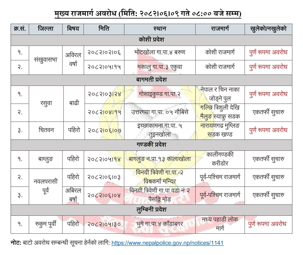 यस्तै, रसुवाको गोसाइँकुण्ड गाउँपालिका-२ पासाङल्हामु राजमार्गस्थित नेपाल-चीन जोड्ने मितेरी पुल, चितवनको इच्छाकामना गाउँपालिका-५ स्थित मुग्लिङ-नारायणघाट सडकखण्ड र रुकुम पूर्वको भूमे गाउँपालिका-४ स्थित मध्यपहाडी लोकमार्ग पूर्ण रूपमा अवरुद्ध भएका केन्द्रीय प्रहरी प्रवक्ता एवं प्रहरी नायब महानिरीक्षक विनोद घिमिरेले जानकारी दिए ।