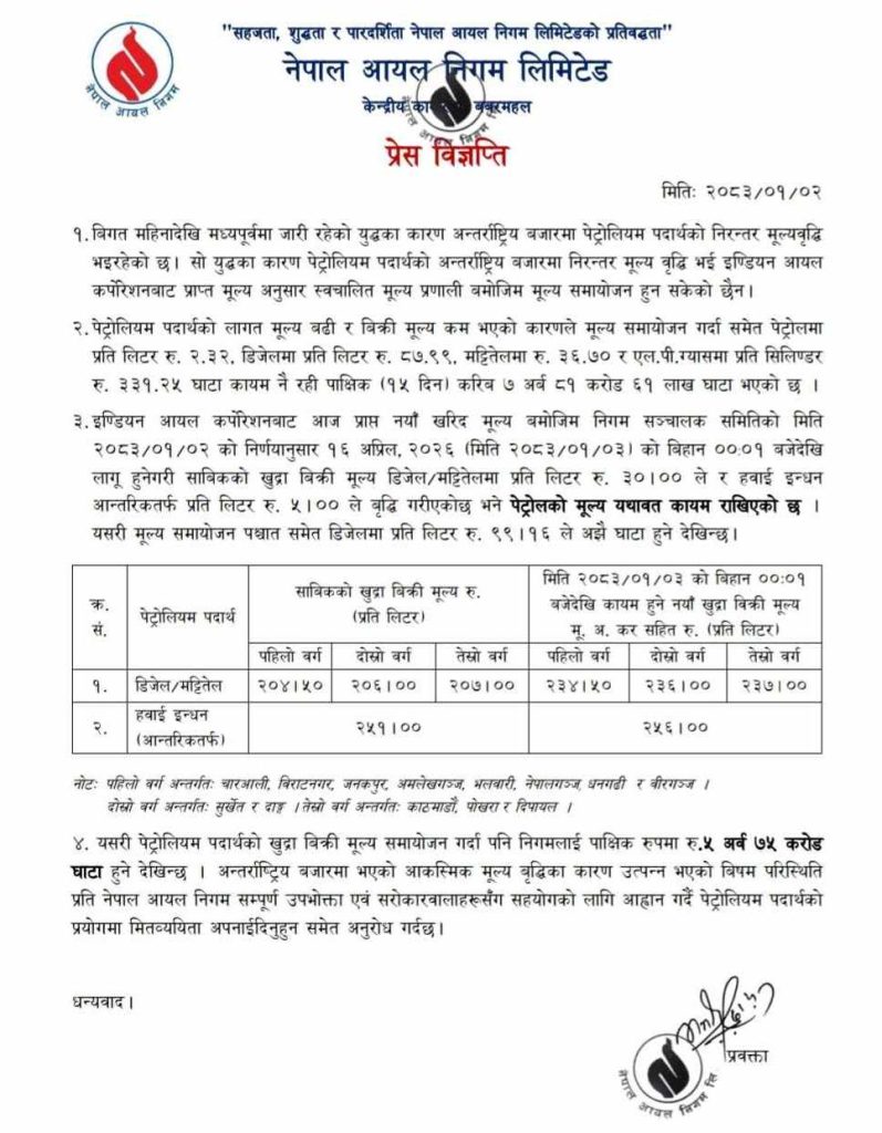 नयाँ मूल्यसूची अनुसार डिजल र मट्टीतेलमा प्रतिलिटर ३० रुपियाँ र हवाई इन्धमा प्रतिलिटर पाँच रुपियाँले वृद्धि गरिएको छ । परिवर्तित मूल्यअनुसार, डिजल र मट्टीतेलको प्रतिलिटर दुईसय ३७ पुगेको छ । हवाई इन्धनको मूल्य प्रतिलिटर दुईसय ५६ रुपियाँ पुगेको छ ।