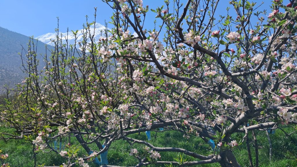 मुस्ताङ । यहाँको स्याउ बगैँचा सेताम्मे भएका छन् । बगैँचाभित्रको स्याउका बोटहरु फूलेर सेताम्मे हुँदै जान थालेका हुन् ।