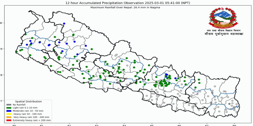 जल तथा मौसम विज्ञान विभाग, मौसम पूर्वानुमान महाशाखाद्वारा जारी मौसम ‘बुलेटिन’का अनुसार कोशी प्रदेशको पहाडी र तराई तथा बाँकी पहाडी भूभागमा आंशिक बादल लाग्ने र बाँकी तराई भूभागमा मौसम मुख्यतया सफा रहनेछ । देशका हिमाली भूभागका एक–दुई स्थानमा मेघगर्जन/चट्याङसहित मध्यमसम्मको वर्षा/हिमपातको सम्भावना रहेको ‘बुलेटिन’मा जनाइएको छ ।