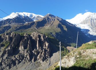 जाडो बढेसँगै गाउँ झारिएका याकचौरी मनाङ ङिस्याङ गाउँपालिका–५मा अवस्थित मुङ्जेगाउँ छेउछाउमा चरिरहेका । पृष्ठभूमिमा मुङ्जे गाउँ र अन्नपूर्ण दोस्रो हिमाल । तस्बिर: नवीन लामिछाने /रासस