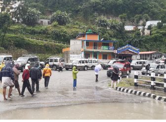 बेनी जोमसोम सडकखण्ड अन्तर्गत म्याग्दीको बैसरीमा गएको पहिरोका कारण बाटो अवरुद्ध भएपछि गलेश्वर पुलमा अलपत्रमा परेका यात्रु । तस्बिर: वासुदेव पौडेल/रासस