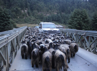 दसैँका लागि देशका विभिन्न ठाउँको सहरमा निकासीका लागि उपल्लो मुस्ताङबाट कोवाङको बोक्सीखोलामा ल्याइएको च्याङग्राको बथान । दसैँका लागि मुस्ताङबाट भेडाच्याङग्रा निकासी हुन थालेको छ । तस्बिर: सन्तोष गौतम/रासस
